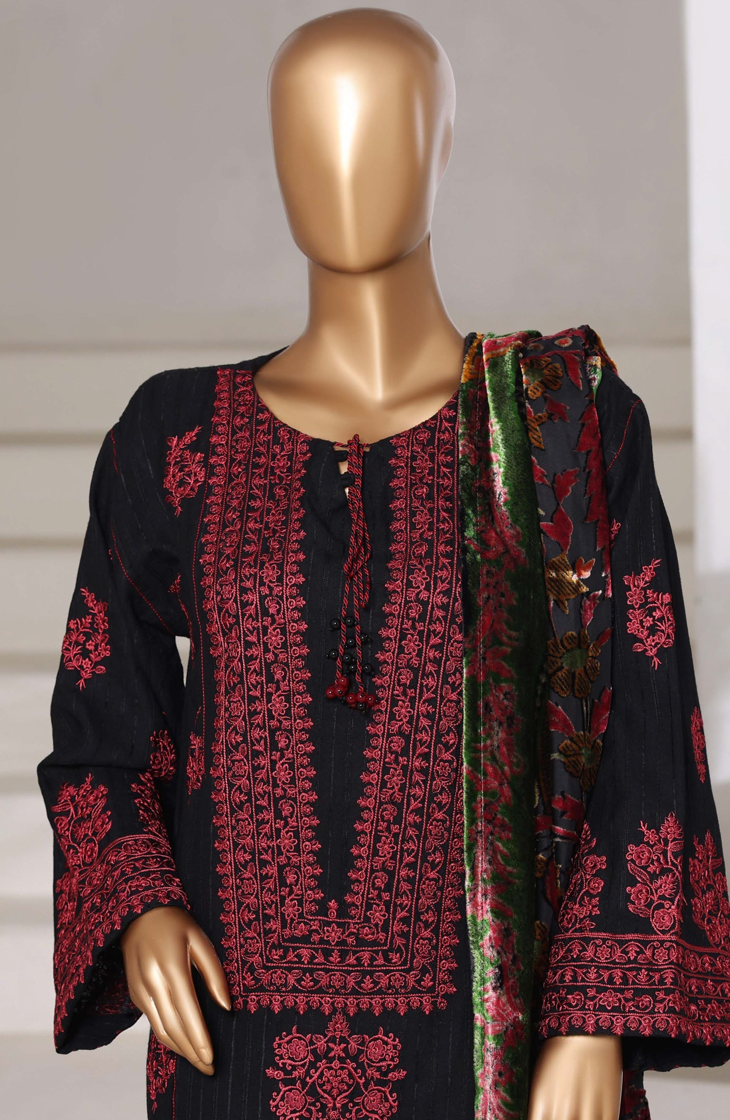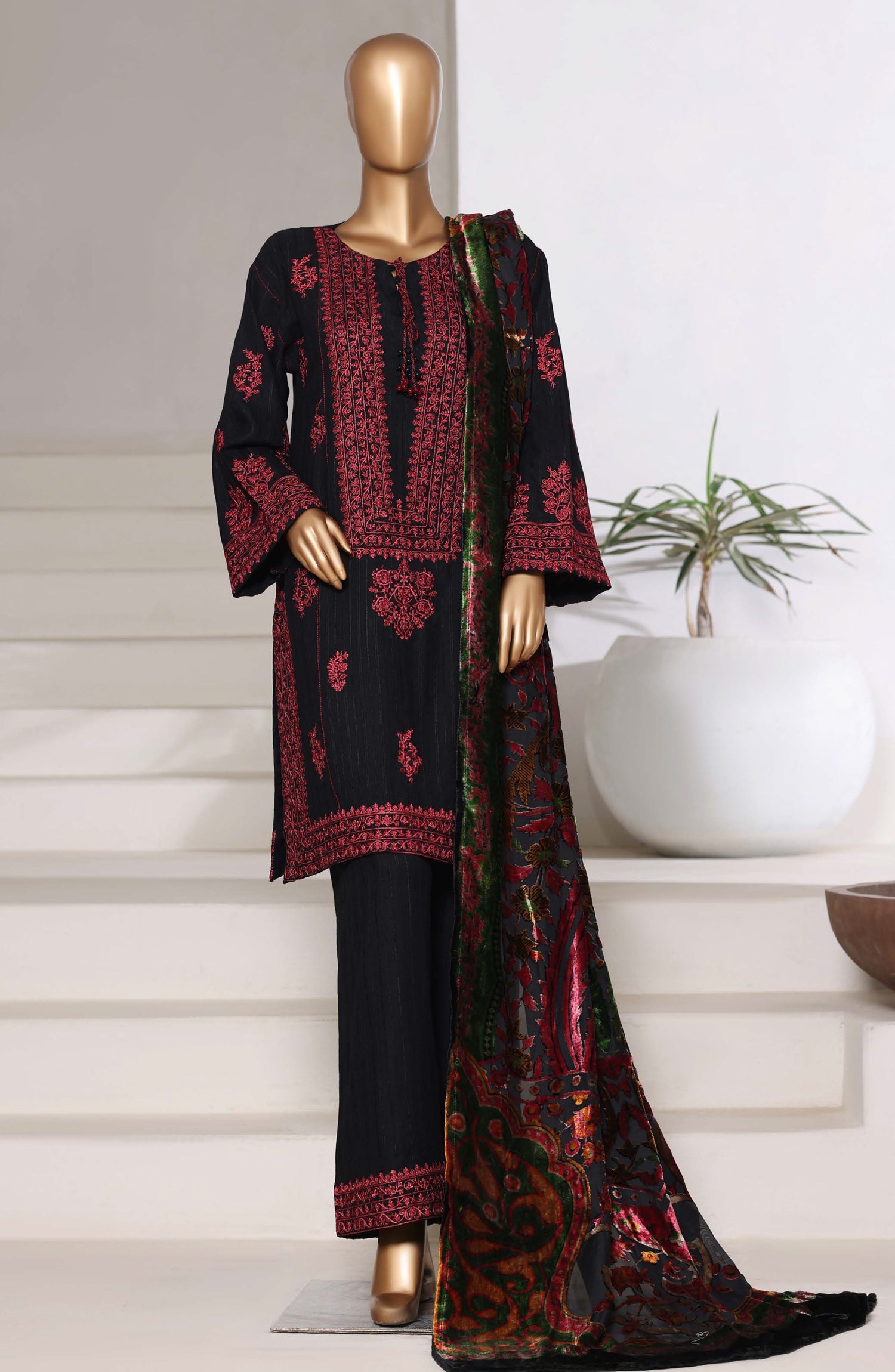 3-PC Stitched Embroidered Dhanak With Palachi Shawl By Sadabahar | Black