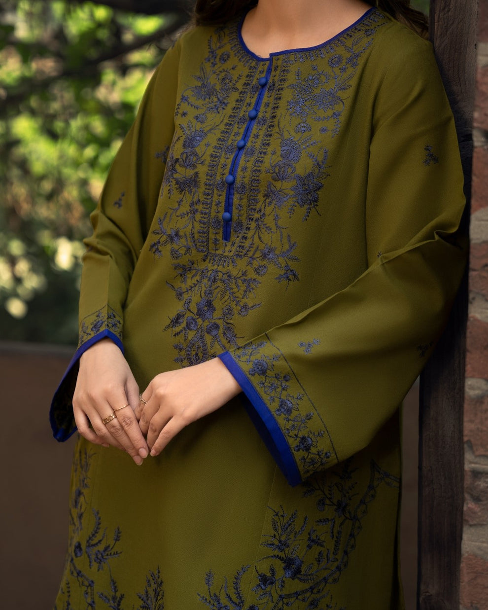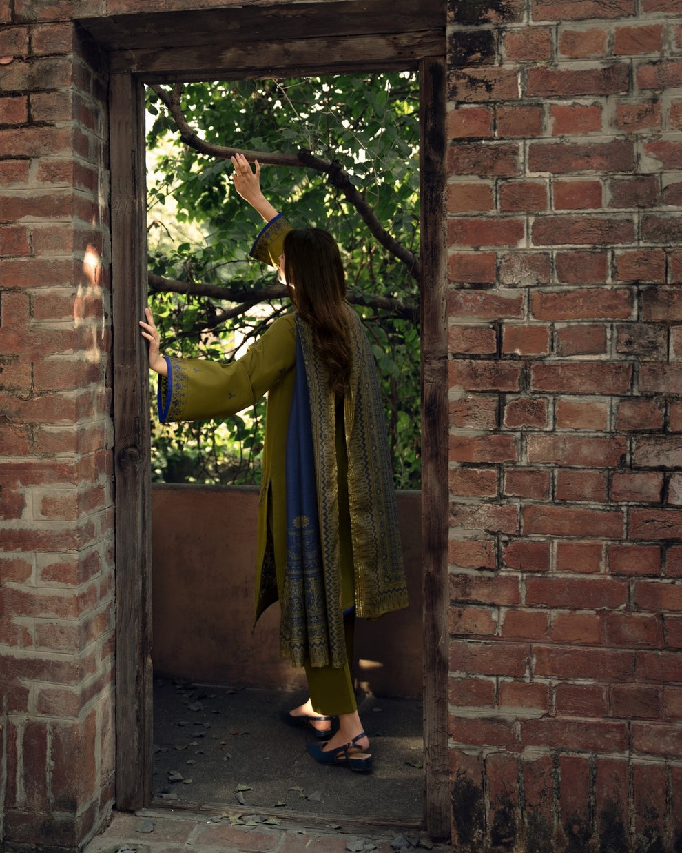3-PC Stitched Embroidered Shadow Khaddar Drop By Casual Lite | Green