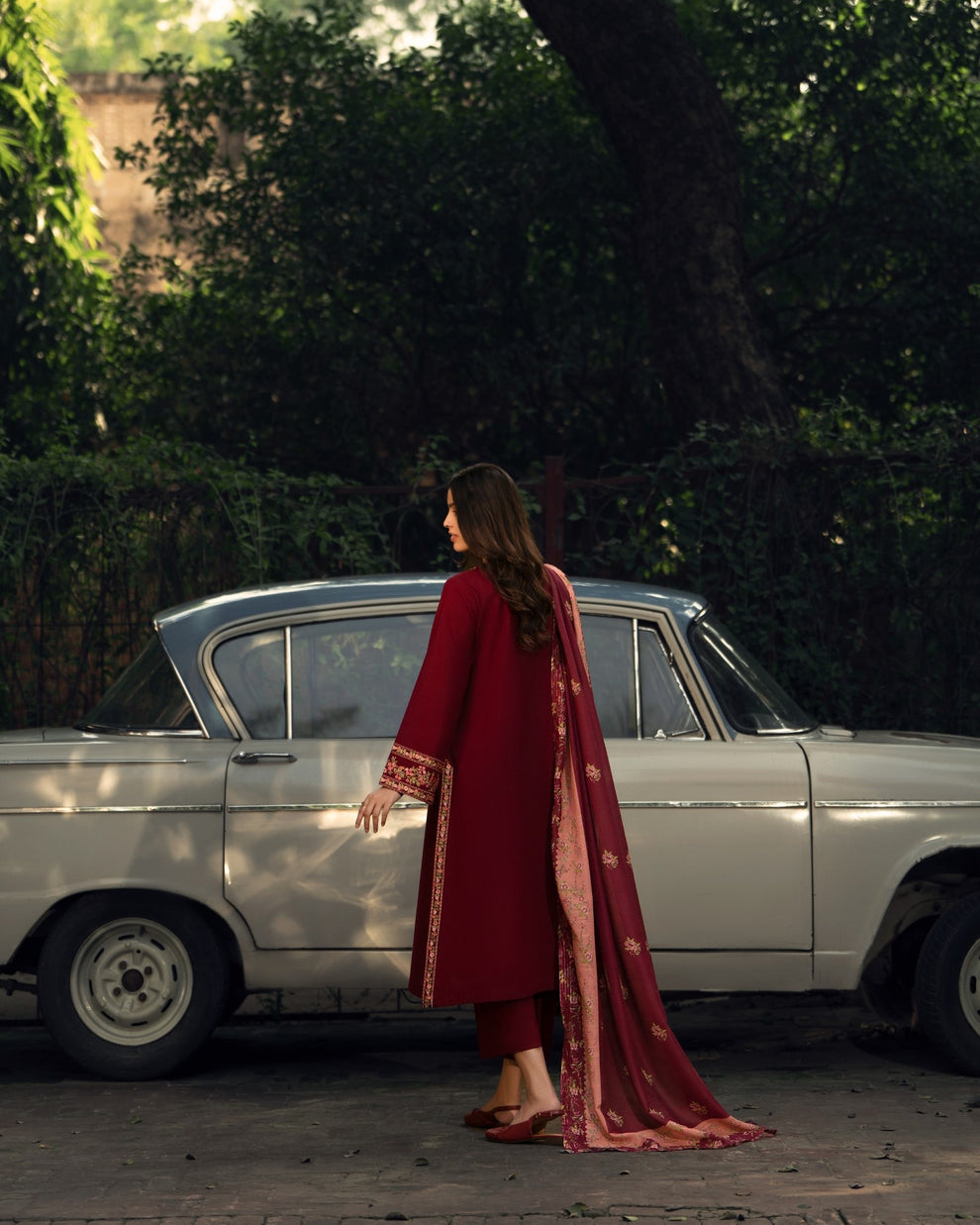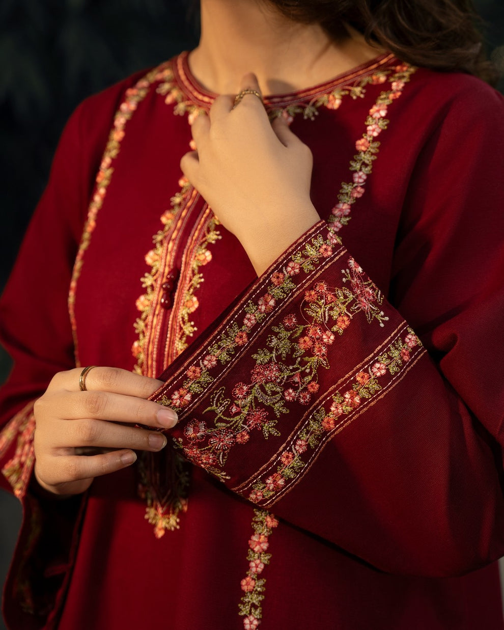 3-PC Stitched Embroidered Shadow Khaddar Drop By Casual Lite | Wine Red