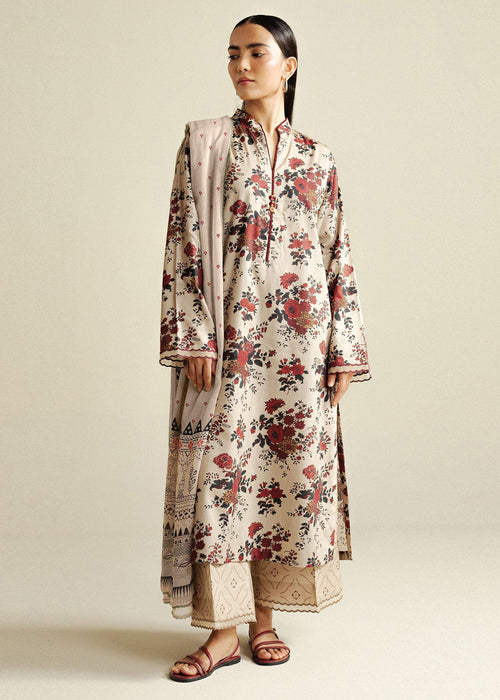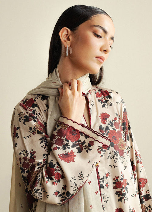 A soft mocha mousse shirt enlivened with a colorful print, paired with a printed trouser and a vibrant dupatta that adds a cool, contemporary balance. Digital Printed Chiffon Dupatta 2.5 Mtrs Digital Printed Cotton Satin Shirt 3 Mtrs Digital Printed Cambric Trouser 2.4 Mtrs
