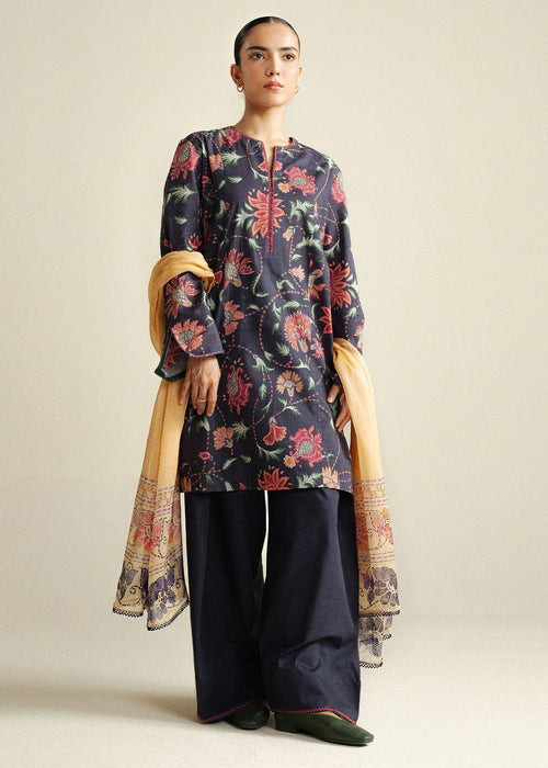 A yale blue shirt featuring delicate kashida-inspired embroidery, paired with a textured trouser and a golden tan dupatta that adds warmth and balance. Digital Printed Chiffon Dupatta 2.5 Mtrs Digital Printed Slub Cotton Shirt 3 Mtrs Digital Printed Cambric Trouser 2.4 Mtrs