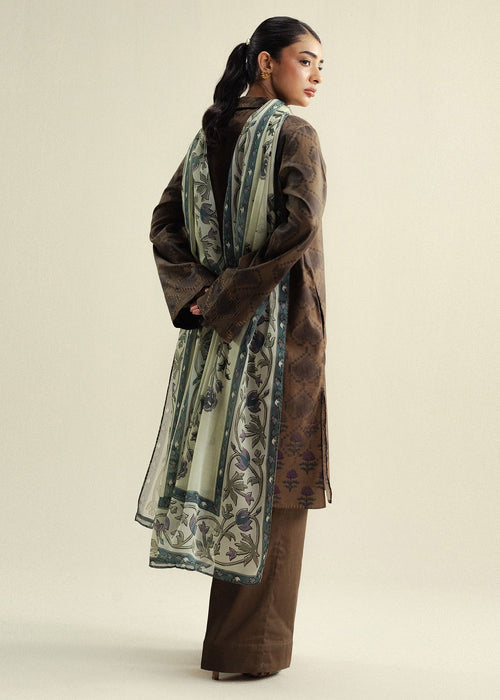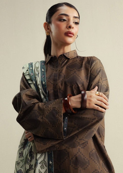 A bronze olive shirt set on a rich canvas, paired with a plain trouser and complemented by an off-white dupatta that adds lightness and balance. Digital Printed Silk Dupatta 2.5 Mtrs Digital Printed Cotton Satin Shirt 3 Mtrs Digital Printed Cambric Trouser 2.4 Mtrs