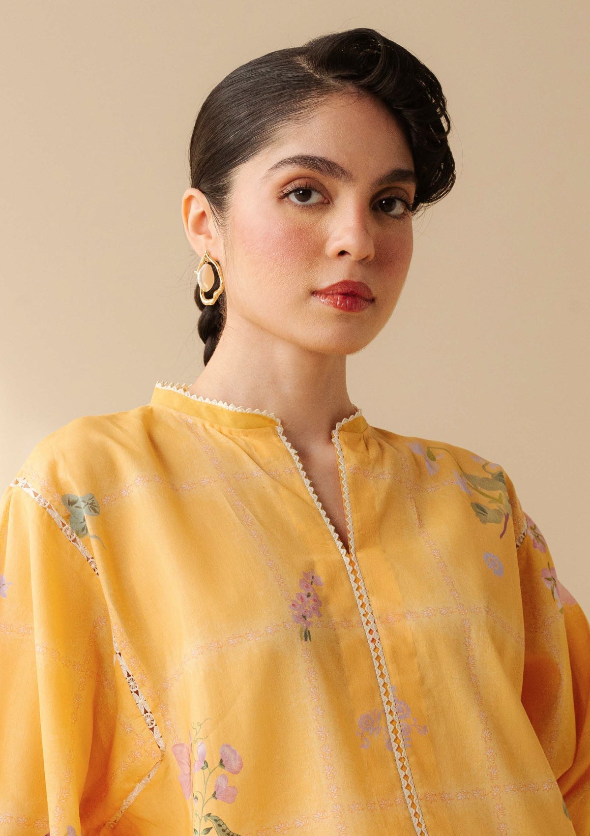 A playful yellow print shirt teamed with cuffed trousers and a dusty-toned dupatta for an effortlessly chic look.