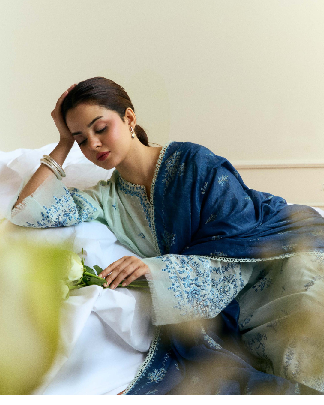 Cool aqua tones meet delicate embroidery, paired with a