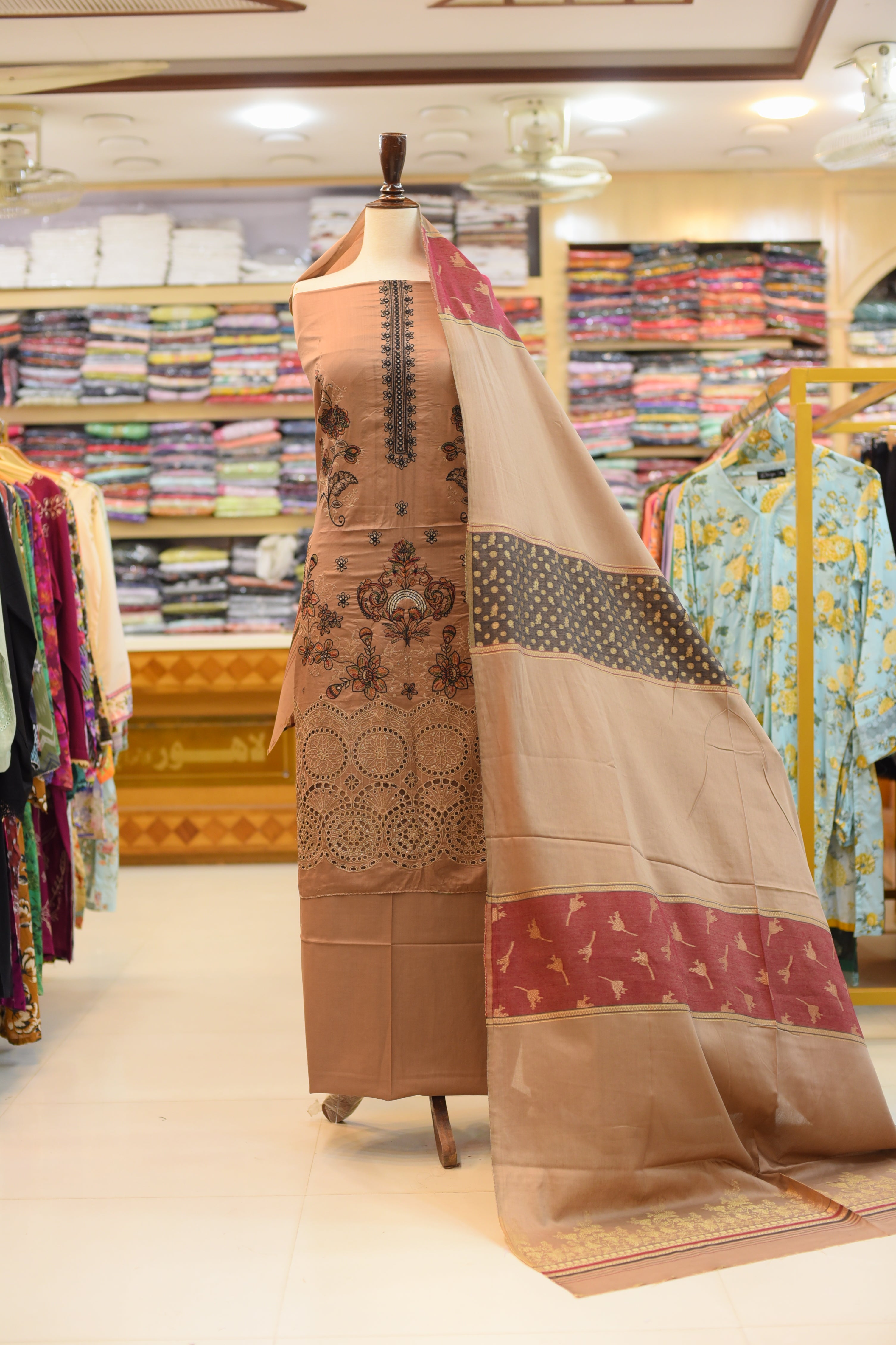 3pc Embroidered lawn with printed bnarsi duppta & jacquard duppta Price